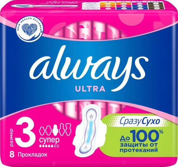 Прокладки гігієнічні Always (Олвейс) Ultra Super чудовий засіб захисту при всіх видах виділень. Дарує неперевершену свіжість та забезпечує почуття впевненості для тих моментів, коли вам необхідний додатковий захист.