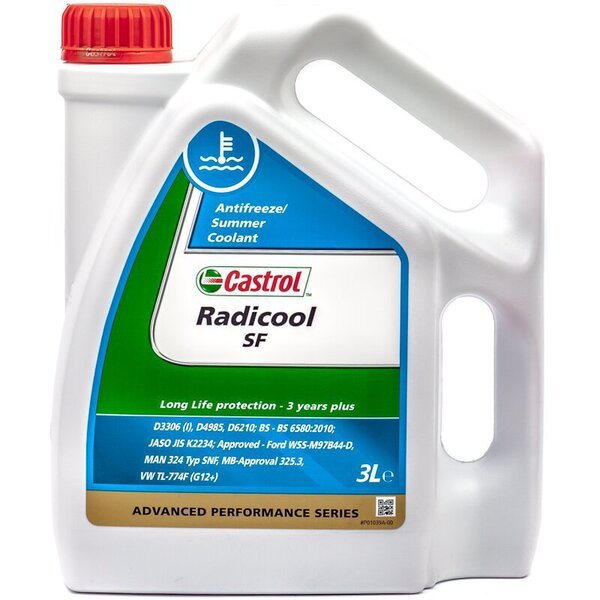 Спеціальний пакет інгібіторів, що використовується в Castrol Radicool SF, дозволяє збільшити інтервали заміни, забезпечуючи чудовий захист від корозії, блокування системи охолодження, перегріву і замерзання. Особливо підходить для використання в двигунах з чавуну, алюмінію, міді або комбінацій цих металів, що застосовуються в сучасних конструкціях двигунів. Вона також сумісна з усіма стандартними гумовими шлангами, прокладками та ущільнювачами, що використовуються в системі охолодження. Castrol Radicool SF має більш тривалий термін експлуатації завдяки збільшеним інтервалам заміни до 3 років і більше. Збільшені інтервали заміни означають зниження витрат і меншу ймовірність заподіяння шкоди навколишньому середовищу. Castrol Radicool SF забезпечує чудовий захист від кавітаційної корозії та ефективне змащування водяного насоса, зменшуючи знос і шум. Технологія присадок, що використовується в Castrol Radicool SF, запобігає утворенню кальцієвих відкладень (накипу) при використанні жорсткої води, тим самим зменшуючи ймовірність блокування радіатора і обмеження потоку охолоджуючої рідини. Ця технологія також покращує властивості теплопередачі рідини, забезпечуючи роботу двигуна при оптимальних температурах. Castrol Radicool SF схвалена низкою автовиробників, включаючи Mercedes Benz, Volkswagen, MAN і Ford. Вона також рекомендована для двигунів General Motors GM 6277M, Deutz, Cummins серії IS і N14, Jenbacher, Komatsu, Renault Type D, Jaguar CMR 8229 і MTU MTL 5048 серії 2000C&I. Castrol Radicool SF містить гіркий агент для запобігання випадкового проковтування.