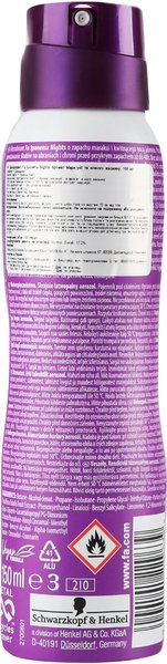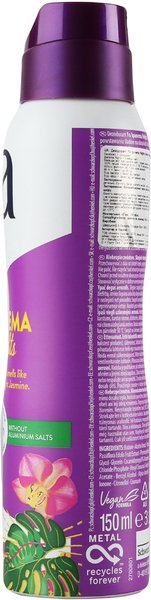 | Склад | Butane, alcohol denat., propane, isobutane, propylene glycol, triethyl citrate, parfum (fragrance), passiflora edulis fruit extract, phenoxyethanol, linalool, benzyl salicylate, limonene, 1,2-hexanediol, caprylyl glycol, glycerin, cocamidopropyl PG-dimonium chloride phosphate, hexyl cinnamal, menthyl acetate, benzyl alcohol, alpha-isomethyl ionone, citronellol, coumarin |