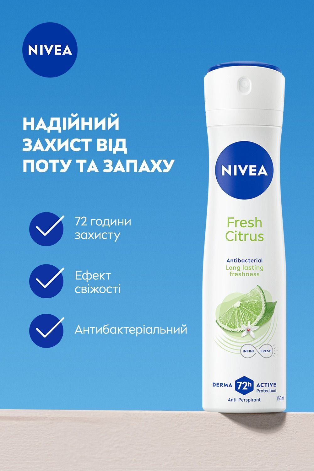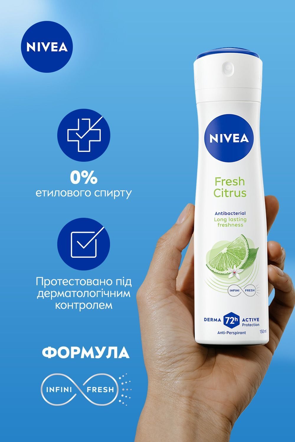 Відкрийте для себе тривалу свіжість, усуньте поганий запах та отримайте надійний захист на 72 години. Секрет криється в унікальній формулі Nivea Infinifresh: завдяки своїй антибактеріальній силі, він не тільки маскує запах, а й усуває бактерії ще до того, як може виникнути поганий запах. Відчуйте свіжий цитрусовий аромат, що заряджає енергією. І отримайте захист з турботою про вашу шкіру. Містить 0% етилового спирту.