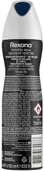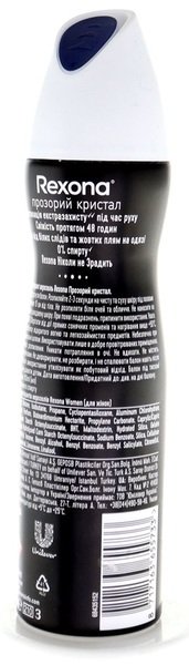 Антиперспірант-аерозоль Rexona Невидима Прозорий кристал не підведе тебе в будь-якій ситуації. Він ефективно запобігає утворенню плям, щоб тобі більше не довелося ламати голову над тим, що вдягнути. Тепер ти зможеш забути про неприємний запах і сліди вологи на одязі. Цей жіночий дезодорант-антиперспірант безкомпромісно захищає від поту і запаху протягом 48 годин. Він створений з використанням інноваційної технології Motionsense. З чистим і прозорим ароматом соковитого грейпфрута зі свіжими нотками конвалії та фрезії з мускусно-амбровим акордом ти почуватимешся свіжим і комфортним у будь-якій ситуації. Прогулянковий крок, неспішна пробіжка, спринтерський біг - тобі все під силу, адже ми подбали про твій захист. Чим би ти не займалася, ти будеш відчувати тільки свіжість і комфорт. Ти створена для руху. Тепер у тебе є антиперспірант, який зможе підлаштуватися під ритм твого життя. Підкорюєте ви нову вершину, поспішаєте на автобус, виступаєте з доповіддю або йдете на побачення, будьте певні, ви надійно захищені від поту і запаху - що б ви не запланували, у Rexona є рішення! Наші продукти працюють так само ефективно, як і ви. Ми прагнемо дізнатися про піт якомога більше, щоб потім використовувати отримані знання для створення інноваційних формул наших продуктів. Rexona ніколи не підведе!