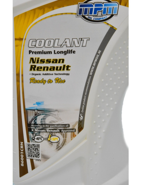 Антифриз MPM Premium Longlife Renault/Nissan жовтого кольору призначений для сучасних систем охолодження. Готовий до застосування склад не потребує розведення. Забезпечує захист від замерзання до -40°C. Безсилікатна формула сприяє зниженню утворення відкладень. Відповідає вимогам Renault та Nissan.