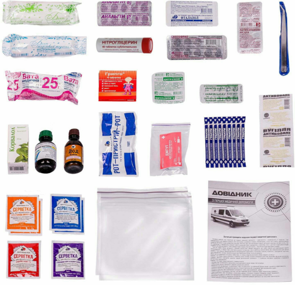 | Комплектація (можливі зміни в різних поставках) | Активоване вугілля табл., Анальгін табл. (0,5 № 10), Ацетилсаліцилова кислота таблетки №10, Бинт нестерильний (5х0,1 м), Бинт нестерильний (5х10 см), Валеріани настоянка табл. 25 мл, (10), Валідол таблетки №10, Вата нестерильна (25 г), Джгут текстильний, Йод розчин (5% 20 мл), Корвалол настойка 25 мл, Лейкопластир бактерицидний (7,2х1,9 см) – 4 шт., Пакет п/е із застібкою (4х7 см) – 2 шт., Пінцет стерильний, Раунатин таблетки №10, Серветка для обробки шкіри з розчином аміаку (10х18 см) – 2 шт., Серветка для обробки шкіри з розчином перекису водню (10х18 см) – 2 шт., Серветка медична з хлоргексидином (10х18 см), Серветка медична антимікробна з фурагініном (10х18 см), Септефрил таблетки №10, Довідник надання першої допомоги, Пристрій для штучного дихання, Формуляр, Фталазол таблетки №10, Футляр для аптечки, Хелпекс таблетки – 1 шт., Цитрамон таблетки №6 |