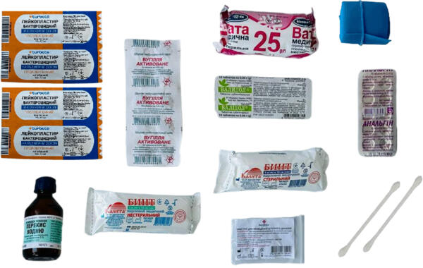 | Комплектація (можливі зміни в різних поставках) | Активоване вугілля табл., Анальгін табл. (0,5 № 10), Бинт нестерильний (5х0,1 м), Бинт нестерильний (7х0,14 м), Валідол таблетки №10, Вата нестерильна (25 г), Ватні палички – 2 шт., Джгут гумовий, Лейкопластир бактерицидний (7,2х1,9 см) – 4 шт., Перекис водню 3% 40 мл, флакон, Перелік вкладень, Плівка клапан для проведення штучного дихання одноразовий, Сертифікат, Довідник надання першої допомоги, Футляр для аптечки |