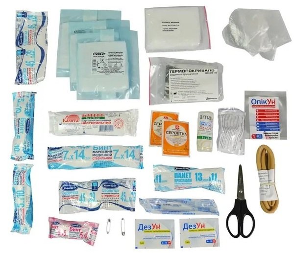 | Комплектація (можливі зміни в різних поставках) | Бинт стерильний (5х0,1 м) – 2 шт., Бинт стерильний (7х0,14 м), Бинт еластичний (0,08х3 м), Булавка англійська – 2 шт, Джгут гумовий, Косинка медична перев`язувальна (90х90 см), Ножиці тупокінцеві, Пакет перев`язувальний стерильний (13х11 см), Пара поліетиленових рукавичок, Пінцет стерильний, Пов`язка гелева антимікробна "ОпікУн" (5х5 см), Серветка для обробки ран стерильна 2 шт. у комплекті (10х10 см) – 3 шт., Серветка для обробки ран №1 (45х29 см) – 2 шт., Серветка медична антимікробна з фурагіном (10х13 см) – 2 шт., Сертифікат, Довідник надання першої допомоги, Термопокривало (210х160 см), Пристрій для штучного дихання, Футляр для аптечки м`який (21х8х15 см) TR |