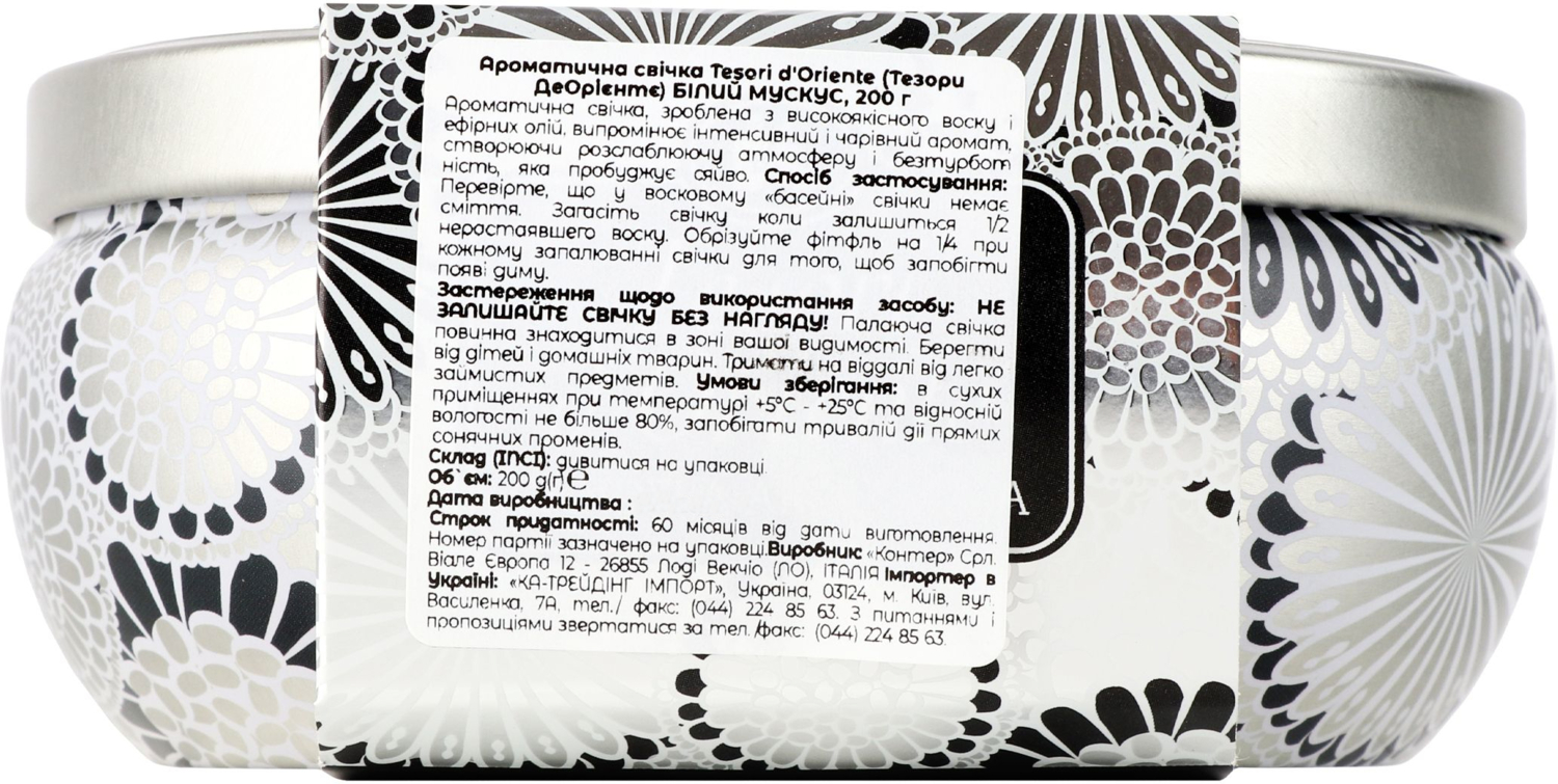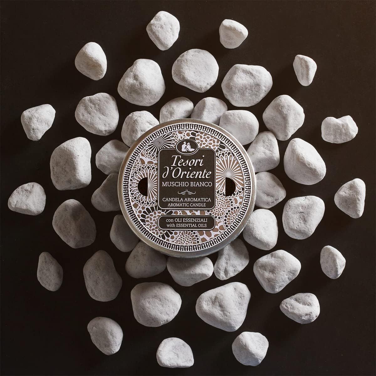 Основу аромату складають ефірні олії білого мускусу, відомі своїми заспокійливими властивостями та здатністю створювати атмосферу розкоші та витонченості. Білий мускус надає свічці ніжний, субтильний аромат, який відмінно підходить для медитації, відпочинку після важкого дня або створення особливої атмосфери під час романтичної вечері. Гармонійний баланс між білим мускусом і бурштином перетворює ароматичну свічку Tesori d'Oriente на ідеальний вибір для тих, хто прагне додати у своє життя трохи магії та відчути справжній дотик краси.