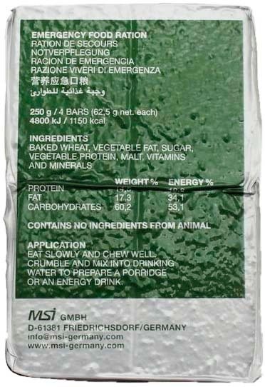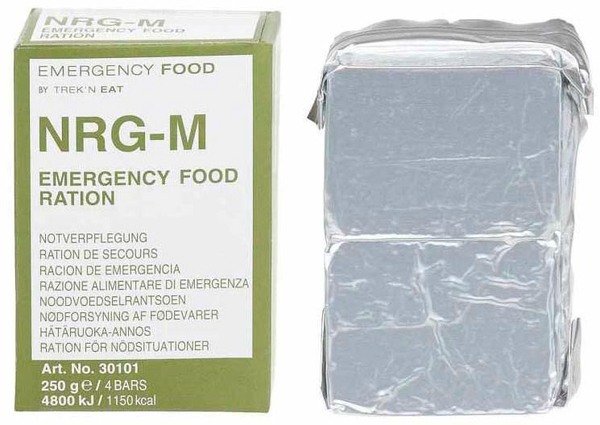Emergency Food NRG-M — висококалорійні пшеничні брикети від швейцарського виробника. Збалансована їжа тривалого зберігання, яку використовують у надзвичайних ситуаціях. Багаті на протеїни брикети можна вживати в оригінальному вигляді, повільно розжовуючи. А також подрібнювати й розбавляти водою до консистенції пюре чи енергетичного напою.