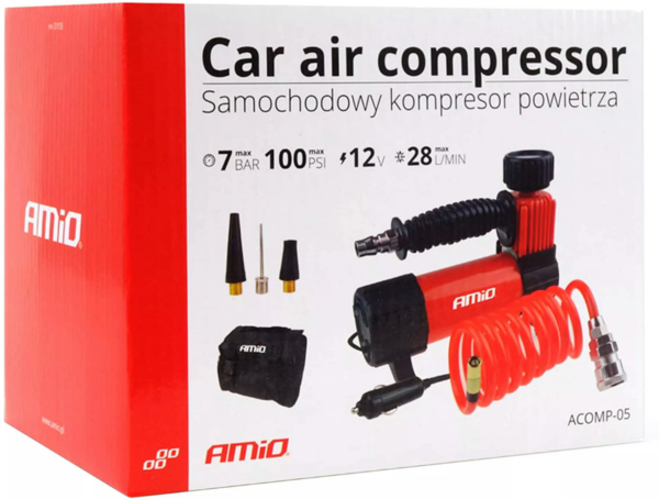 З різними клапанами, що входять до комплекту, Amio HQ Acomp-05 стає універсальним інструментом. Ви зможете легко підкачати не тільки шини автомобіля, а й м'ячі, надувні матраци та навіть велосипедні шини. Це ідеальне рішення для активного способу життя і подорожей. З продуктивністю 28 літрів на хвилину, цей компресор забезпечує швидке та ефективне підкачування, що економить ваш час і скорочує час, проведений на узбіччі дороги. Живлення від прикурювача (12 В) гарантує зручність використання, оскільки ви можете підключити його до стандартної автомобільної розетки.
