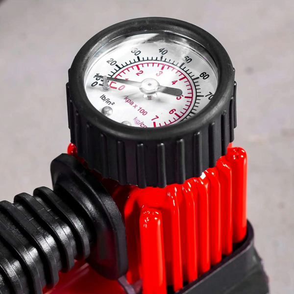 Робочий тиск 7 барів дає змогу легко досягти оптимального тиску у ваших шинах, забезпечуючи безпеку та стійкість автомобіля на дорозі. Вбудований манометр дає вам можливість контролювати тиск у реальному часі, що дає змогу підтримувати ідеальні показники протягом усієї подорожі. Універсальний роз'єм 1/4" дає змогу легко замінити повітряний шланг, забезпечуючи гнучкість і зручність у використанні. А вбудована ручка для перенесення робить транспортування цього компресора максимально зручним.