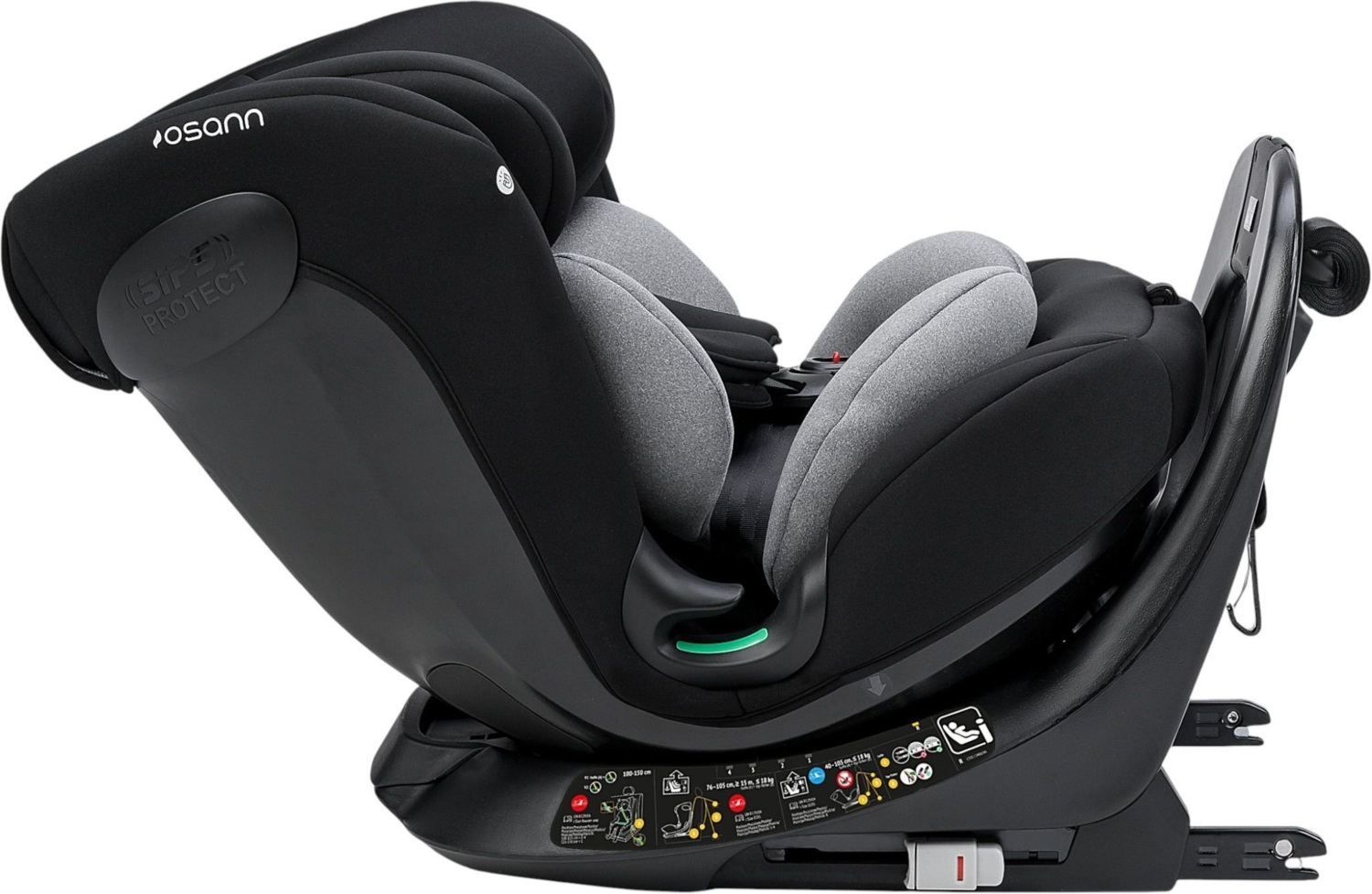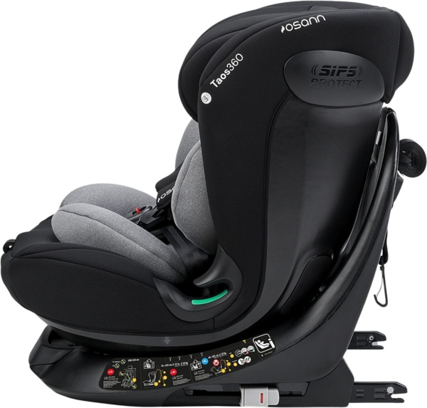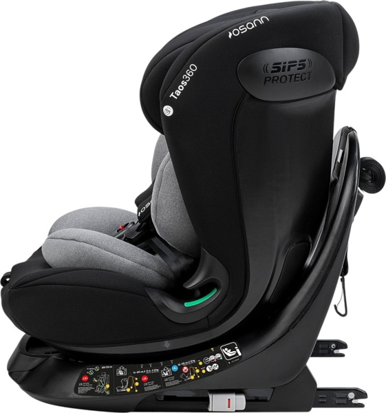 Taos360 має вбудовані бокові захисні елементи. Крім того, боковини сидіння значно висунуті вперед, щоб голова та шия дитини були максимально захищені в дитячому сидінні. Дитяче сидіння було перевірено та сертифіковано відповідно до новітнього стандарту ECE R129/03. Крім того, продукти піддаються додатковим випробуванням, які виходять за межі вимог законодавства. Автокрісла тестуються аналогічно до процедури випробувань ADAC. Таким чином, ви можете бути впевнені, що ваша дитина в дитячому сидінні Osann буде в повній безпеці.