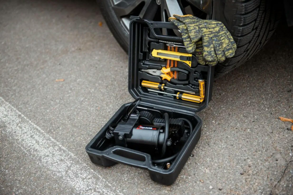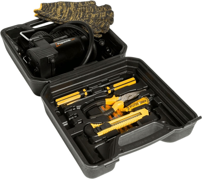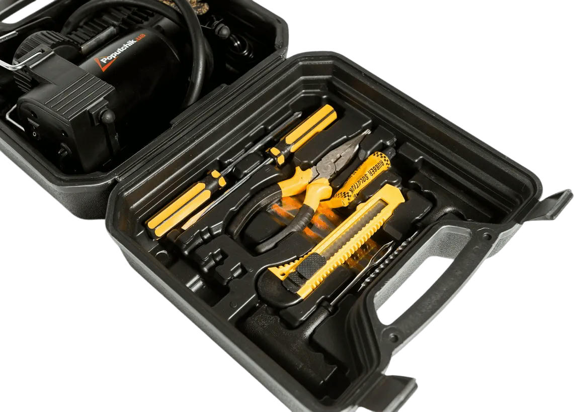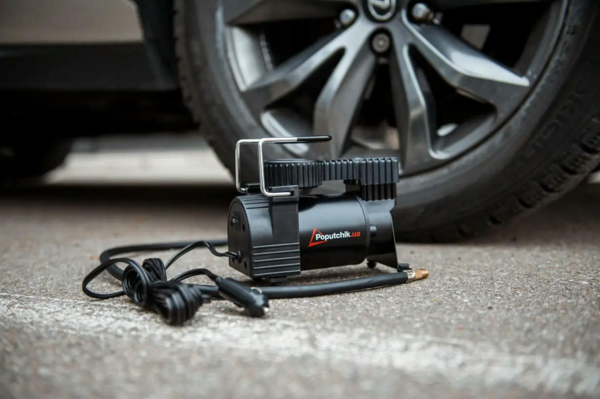 - Компресор автомобільний 1-поршневий Poputchik на 35л/хв, 7 АТМ, кейс + Набір ремкомплекту для шин (13-014-IS)