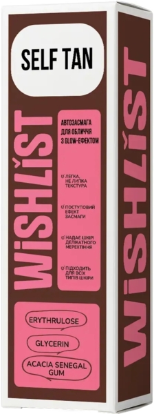 Автозасмага для обличчя з Glow-ефектом Wishlist Self Tan — це безпечний та делікатний спосіб надати шкірі золотистого відтінку та природного сяйва без шкоди для шкіри. Завдяки м’якій формулі з еритрулозою засіб поступово забарвлює шкіру без смуг і жовтизни. Зволожувальні компоненти у складі дбають про комфорт, м’якість, еластичність шкіри та робить шкіру візуально більш рівною та сяючою. Підходить для всіх типів шкіри — особливо для тьмяної, зневодненої чи нерівномірно засмаглої.