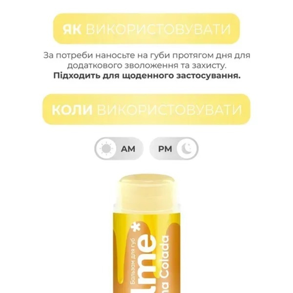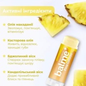 Бальзам для губ Pina Colada Balme з ніжним ароматом ананасу й кокосу м’яко доглядає за шкірою губ, забезпечуючи інтенсивне зволоження та захист у будь-яку пору року. Формула з натуральними оліями та восками створена для щоденного догляду — вона допомагає утримувати вологу, попереджає сухість, тріщини та лущення. Бальзам має легку текстуру, що плавно лягає на губи, залишаючи комфортне відчуття шовковистості та легкий глянцевий блиск. Аромат з яскравими нотками ананасу й кокосу, м’яко відкривається при нанесенні та миттєво підіймати настрій. Ідеально підходить для щоденного використання, коли хочеться додати трішки солодкої магії до свого образу.
