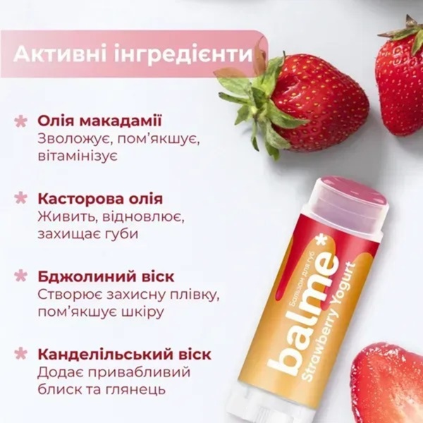 Поринь у солодку ніжність і свіжість стиглої полуниці. Бальзам для губ з ароматом полуничного йогурту — це справжній літній десерт для твоїх губ. Ніжна формула з натуральними оліями зволожує, живить і пом’якшує, а солодкий аромат полуниці дарує чудовий настрій із першого доторку. Бальзам має легкий рожевий відтінок, що надає губам делікатного блиску. Він створений, щоб турбуватись про твої губи щодня — захищає від сухості, тріщин і лущення. Ідеально підходить для щоденного використання, коли хочеться ніжності, свіжості та трішки солодкого натхнення.