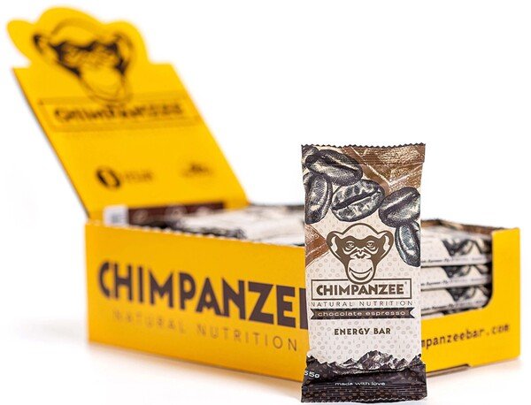 Chimpanzee Energy Bar Chocolate Espresso — енергетичний батончик зі шматочками шоколаду й манливим кавовим ароматом. Має повністю натуральний склад, наполовину складається з органічних продуктів. Містить мікс швидких та повільних вуглеводів для рівномірного насичення організму енергією.