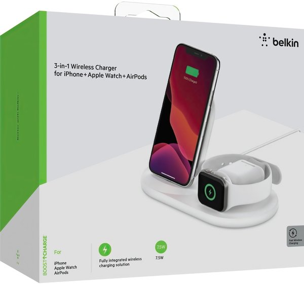 Бездротова док-станція Belkin Qi Wireless iWatch + iPhone + Airpods WIZ001vf Забезпечує підзарядку 3в1. Бездротова зарядна панель потужністю 7,5 Вт заряджає iPhone з максимально можливою швидкістю і 5Вт модуль магнітної зарядки призначене для Apple Watch. Крім того, завдяки оптимальному куту огляду під час зарядки при необхідності можна користуватися як iPhone так і Apple Watch.