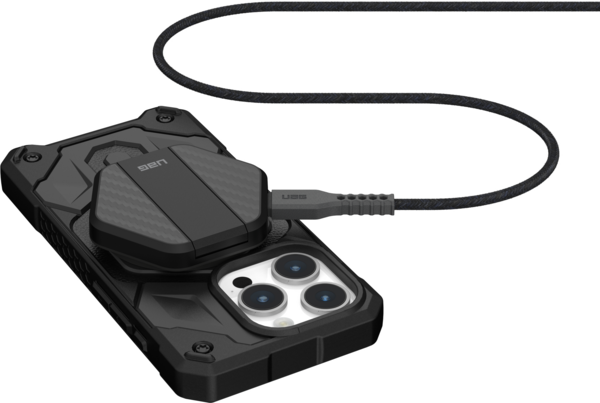 Насолоджуйтесь швидкою та безпроблемною магнітною зарядкою з бездротовим зарядним пристроєм UAG. Вбудовані магніти, які ідеально вирівнюються, забезпечують швидкість заряджання до 15 Вт. Завдяки сумісності з чохлами MagSafe ви можете зручно заряджати свій пристрій, не знімаючи захисний чохол. Вбудована металева підставка дозволяє переглядати відео без допомоги рук, поки пристрій заряджається, щоб ви могли переглядати улюблені шоу або стежити за сповіщеннями. Міцна конструкція, створена для довговічності, має корпус з металевого сплаву, легку вставку з вуглецевого волокна та міцний плетений кабель. Заряджайтеся з легкістю за допомогою бездротового зарядного пристрою UAG.