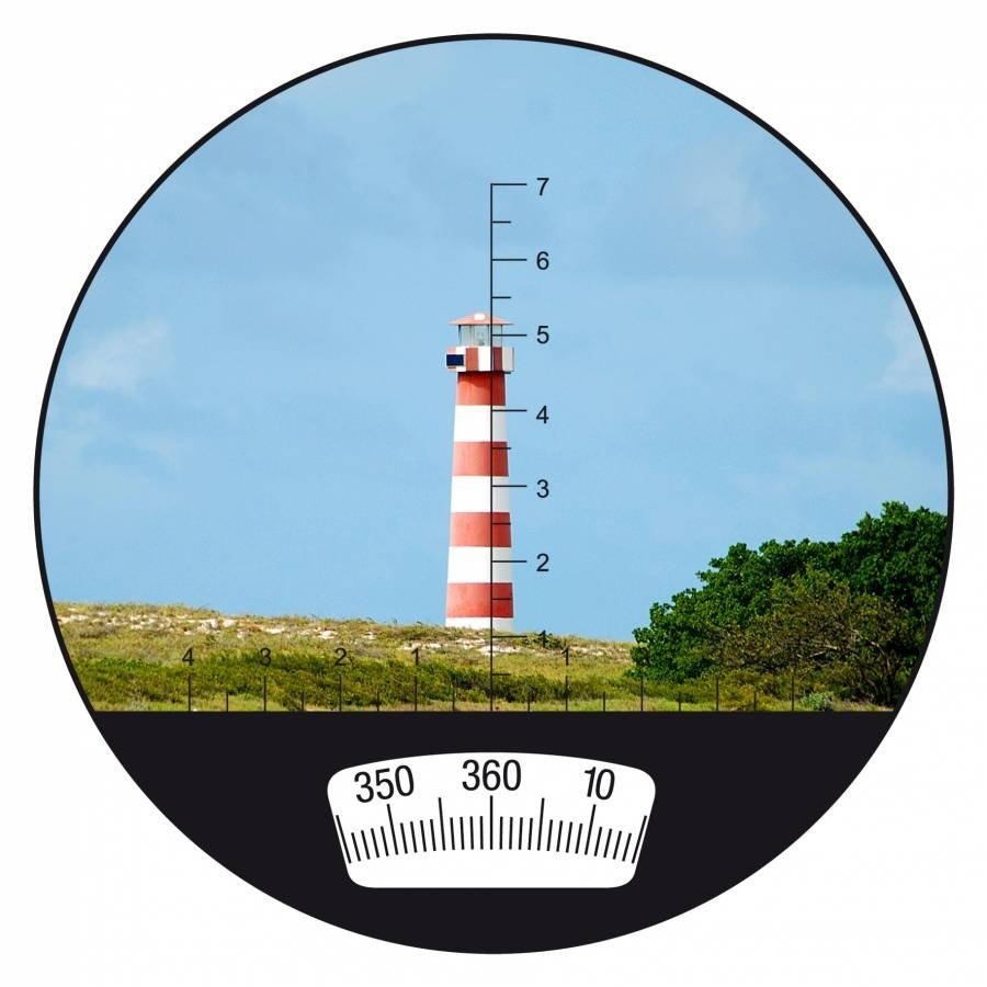 Бінокль Bresser Nautic 7x50 WD Compass - це справжній морський бінокль, який забезпечить яскраве зображення високої чіткості не тільки вдень при яскравому сонці, а й в сутінках, в дощову погоду і при низької хмарності. Якщо Ви шукайте помічника для спостережень на воді, хочете розглядати яхти і пароплави, спостерігати стабільне зображення найдрібніших деталей оснастки на значній відстані, то Бінокль Bresser Nautic 7x50 WD Compass - Ваш вибір. Даний бінокль має класичне поєднання кратності до діаметру (7х50), яке оптимально підходить для тривалих професійних спостережень за любої погоди на борту хитного судна. водозахищеність Зсередини бінокль заповнений азотом, що вбереже оптику від появи конденсату, крапель води, запотівання при різкій зміні температури. оптичні елементи і відсік для елементів живлення герметизовані гумовими ущільнювачами і забезпечують водозащиту по класу IPX7. вбудований компас Одна з основних особливостей цієї моделі - вбудований аналоговий компас. Коли Ви дивитеся в бінокль, по нижньому краю зору розташовується шкала в градусах (від 0 ° до 360 °). Коли в середині шкали позначено 360, це означає, що Ви дивіться на північ. Якщо - 180, то на південь. Підсвічування для умов низької освітленості на зовнішній стороні корпусу розташована кнопка, що включає підсвічування компаса. Підсвічування працює від батарейок, які слід регулярно замінювати для підтримки працездатності приладу. Обчислення розмірів об'єктів Завдяки далекомірної сітці і шкалою також можливо визначити відстань до об'єкта, що спостерігається, знаючи його розмір. Спостерігаючи в окуляр об'єкт, що цікавить, орієнтуйтеся на кількість поділів на візирної сітці. Наприклад, значенням 3.9 за шкалою відповідає 12-метровому будинку. Виставляючи це значення на верхній шкалі вимірювання відстані Ви задаєте систему відліку. Нижня шкала - реальний розмір об'єкта (12 м). У цьому випадку відстань складе 300 метрів, що Ви і побачите на нижній шкалі. Визначення відстані до об'єкта Розмір об'єкта також можна визначити по візирної сітці. Для цього потрібно знати відстань, на яке видалений об'єкт. Вимірювання розмірів відбувається аналогічно визначенню відстані. Виставляючи відповідності верхньої і нижньої шкали , Ви зможете визначити висоту будь-якого об'єкта. Фокусування, межзрачковое відстань завдяки індивідуальній фокусуванні окулярів, бінокль дозволить провести тонке налаштування під будь-якого спостерігача: є можливість діоптрійної корекції в широкому діапазоні. Рухомий центральний шарнір дозволяє змінювати межзрачковое відстань. Наочником окулярів, що складаються типу Fold Down, якщо ви дивитеся в бінокль в окулярах - рекомендується скласти Наочники. Таким чином можна повністю використовувати поле зору бінокля.