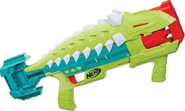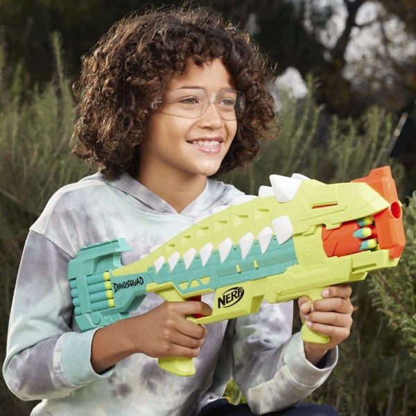 Бластер Nerf DinoSquad Armorstrike - приголомшливий дизайн динозавра Анкліозавра, та барабан на 8 стріл. У комплекті з бластером подвоєна кількість стріл - 8, щоб зарядити барабан, і ще 8 можна зберігати в прикладі (по 4 з 2 боків) для прискореного перезарядження. Пересмикніть руків'я, щоб зарядити бластер, і скористайтеся перевагами його конструкції, щоб точніше прицілитися.