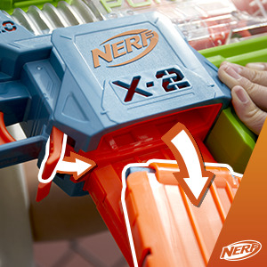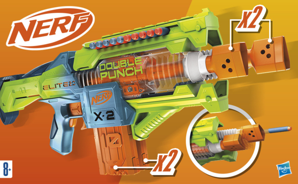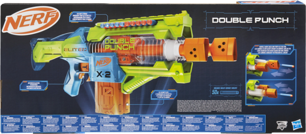 - Бластер Nerf Elite 2.0 Double Punch має 2 стволи, які швидко рухаються вперед і назад під час стрільби.