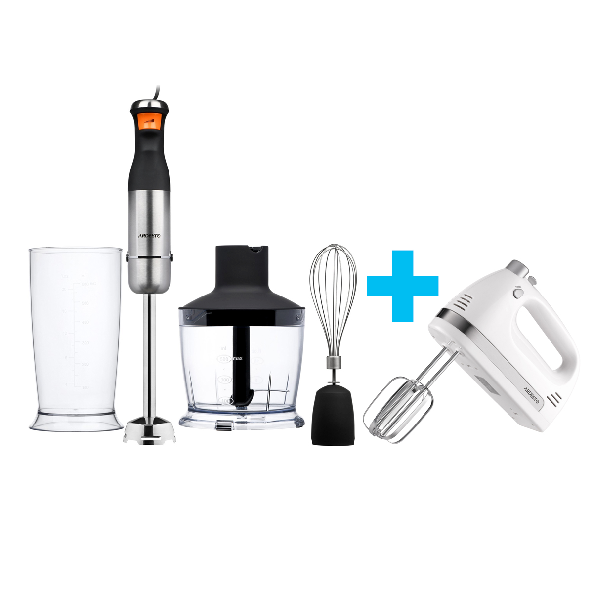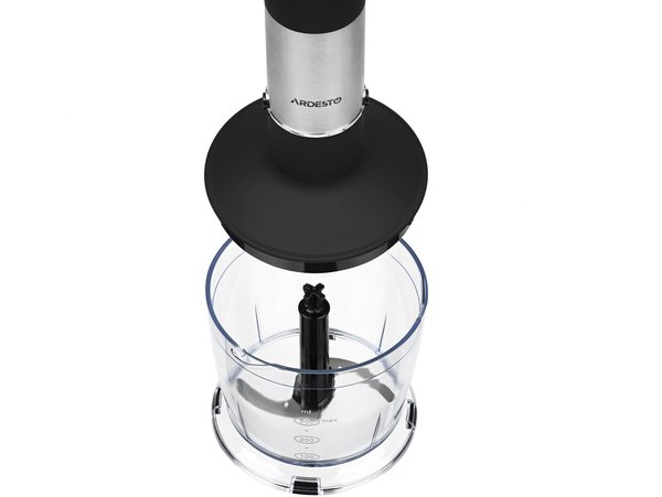 У комплектацію входить мірний стакан на 600 мл та металева насадка для змішування, чаша на 500 мл для подрібнення, а також віничок для збивання. З таким набором можна швидко підготовити інгредієнти для складних страв, зробити коктейль або смузі, а також збити тісто для випічки та млинців або суміш для омлету.