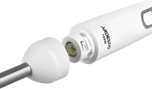 Блендер виконано в ергономічному корпусі білого кольору з міцного полікарбонату, а ножі – з міцної та надійної нержавіючої сталі. Двигун з потужністю 700 Вт захищено від перегріву. Передбачено два режими швидкості – звичайний та турбо. Завдяки продуманої конструкції, пристрій працює з досить низьким рівнем шуму.