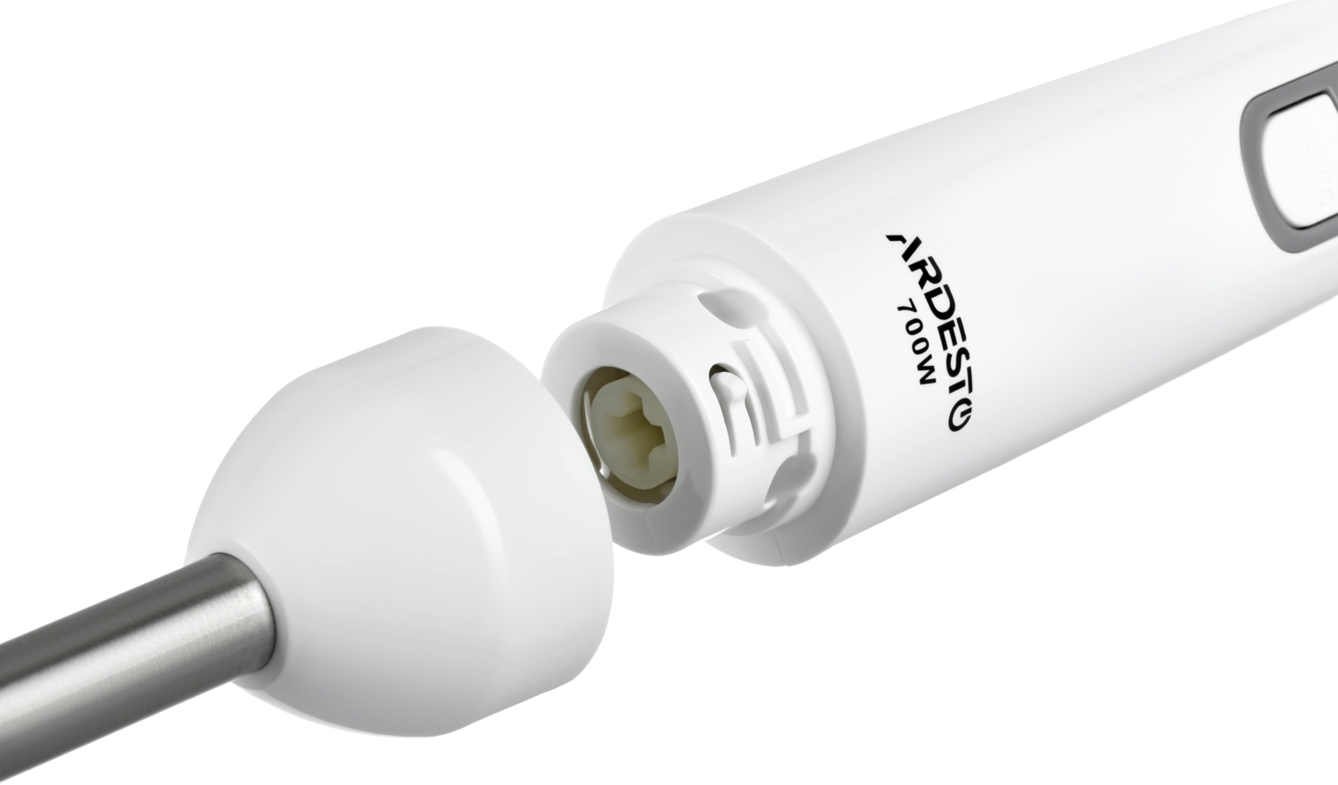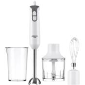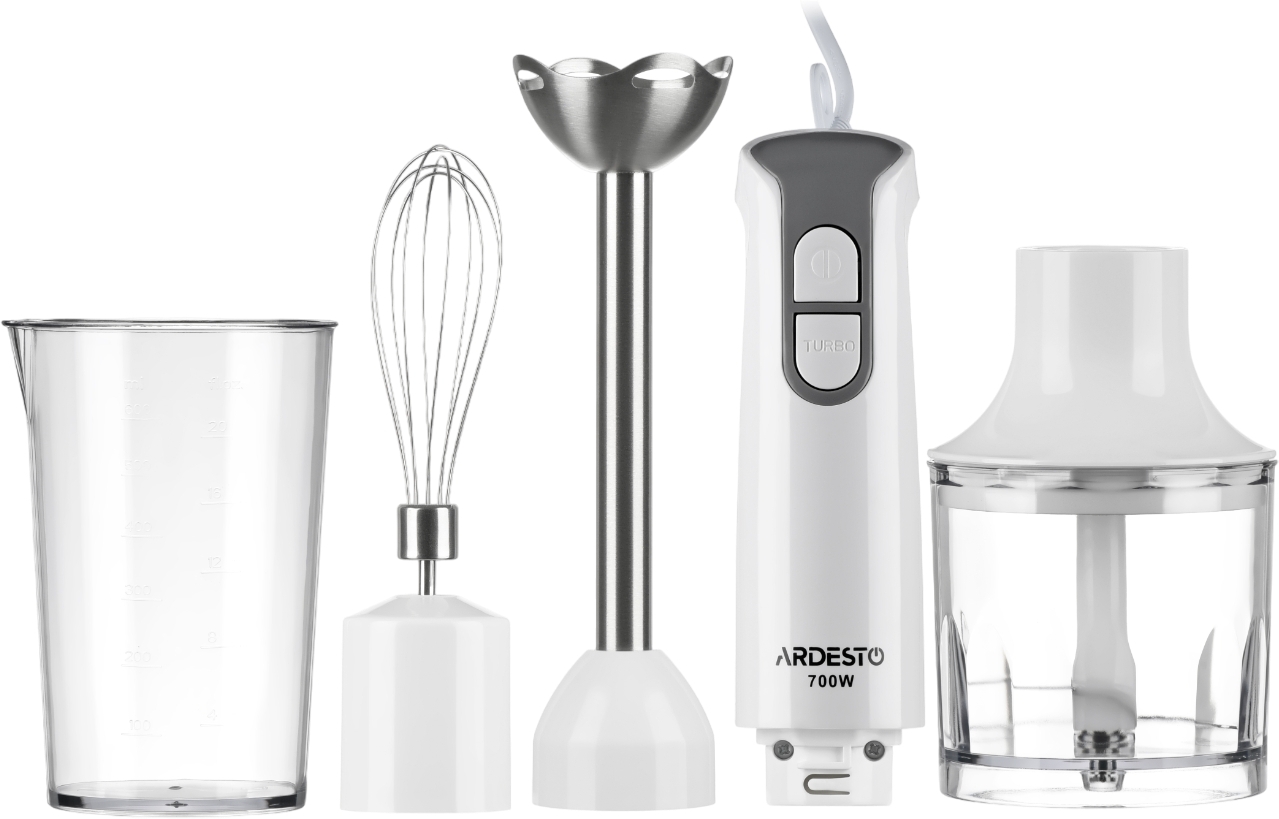 У комплектацію входить мірний стакан на 600 мл та металева насадка для змішування, чаша на 300 мл для подрібнення, а також віничок для збивання. З таким набором можна швидко підготовити інгредієнти для складних страв, зробити коктейль або смузі, а також збити тісто для випічки та млинців або суміш для омлету.