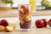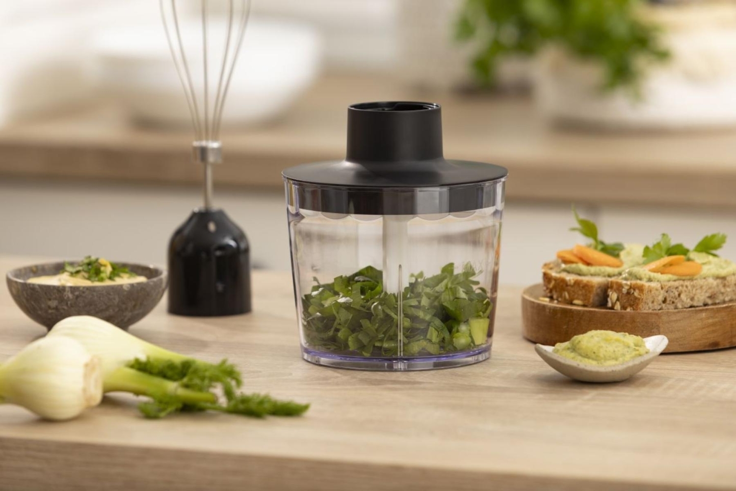 Подрібнювач, що входить до комплекту, забезпечує додаткову зручність, дозволяючи вам легко подрібнювати інгредієнти для салатів, сальси та багато чого іншого — і все це за допомогою однієї простої та компактної насадки.