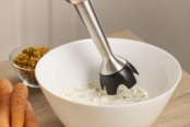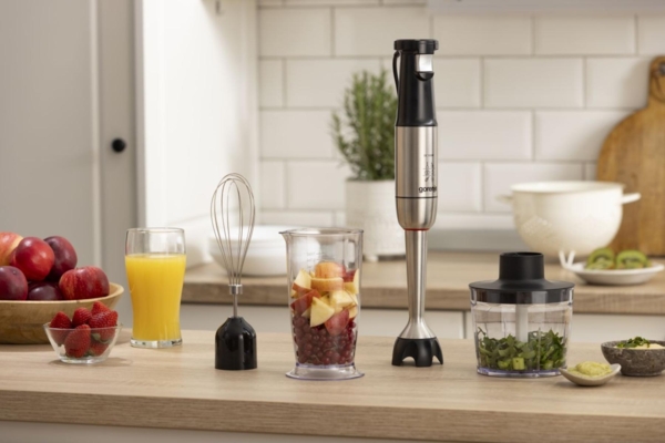 Ручний блендер поєднує в собі блендер, віночок і подрібнювач в одному елегантному дизайні, пропонуючи універсальні можливості для всіх ваших потреб у приготуванні їжі — будь то приготування смузі, збивання вершків або просто подрібнення інгредієнтів.