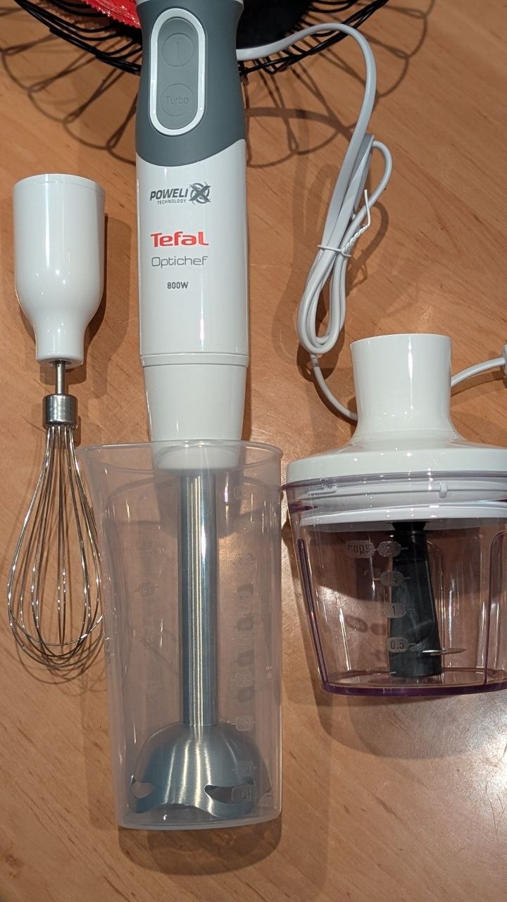 Шукав собi блендер, який впорався б з повсякденними завданнями на кухні. З ключових вимог: - потужність від 800 Вт - класична насадка для подрібнення фруктів/овочів - насадка-вiнчик для збивання білків та приготування кремів - закрита ємнiсть-подрібнювач для фаршу Що маємо на ринку? За цих вимог, якщо уникати зовсім no-name брендів, залишаються Tefal, Gorenje, Bosch, Braun, Zelmer. Braun — дуже дорого, Gorenje має конструктивні недоліки в деяких моделях (але в них гарний тримач для компонентів). Bosch — не дуже великий вибір пiд зазначенi крiтерii, а Zelmer — тотальний брак, коли блендер не тримає насадки. Через усі ці фактори вибрав Tefal і не шкодую. Якщо проаналізувати такі складові, як загальна якість/рейтинг бренду/ціна та функціональність, то цей блендер — золота середина. Досить важкий девайс (був здивований, тому що лежить у руцi файно) і гарно зібраний. Усі насадки чітко встають у пази, а самi кріплення — металеві. Але зверніть увагу: кабель для підключення до мережі — не коротенький! Його довжина лише 1 м, тому якщо у вас розетка досить далеко вiд стола, доведеться користуватися подовжувачем. Також в описі є помилка: об’єм комплектної чаші для збивання — не 500 мл, а 800 мл. Фото з позначкою на мірному стакані — додаю до вiдгуку. Загалом і в цілому, працює — просто чудово. Величезний діапазон швидкостей, леза — гострі, перемелює фрукти/овочі в пюре без жодних нюансiв. Потужності мотора вистачить на будь-які домашні заготовки. Крім того, може працювати на максимальному режимі досить довго: немає перегрівів і сторонніх запахів. Рекомендую!