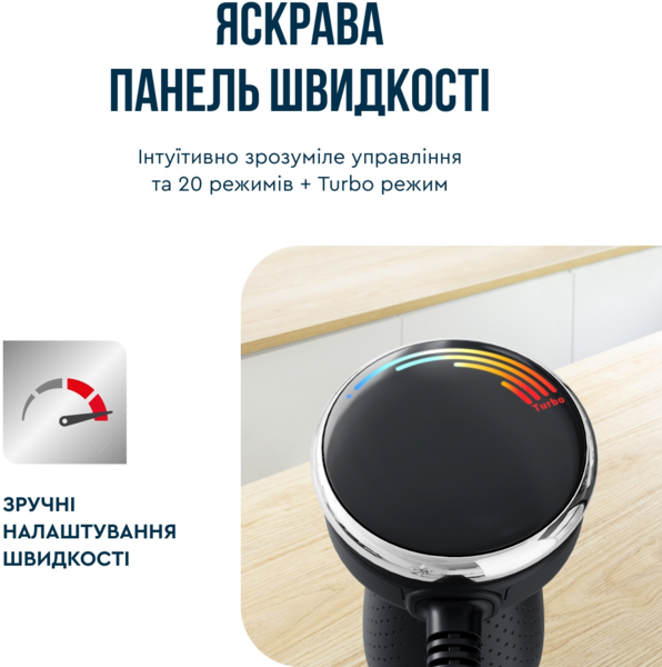 Зручний у використанні циферблат тримає 20 змінних швидкостей і турборежим під рукою, а також надає можливість перемикання швидкостей під час змішування.