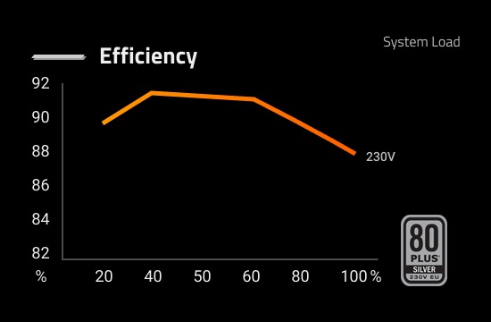 Сертифікація 80 Plus Silver гарантує 90% ККД при 50% навантаженні, що призводить до зменшення втрат енергії, зниження тепловиділення та мінімізації шуму вентилятора.