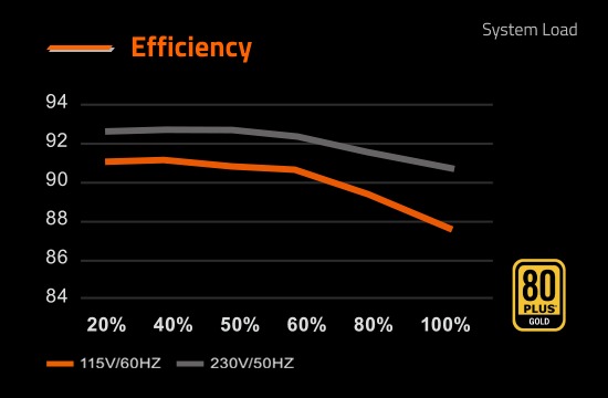 Сертифікат 80 Plus Gold гарантує 90% ККД при 50% навантаженні. Краща енергоефективність призводить до менших втрат енергії, меншого нагрівання і меншого шуму вентилятора.