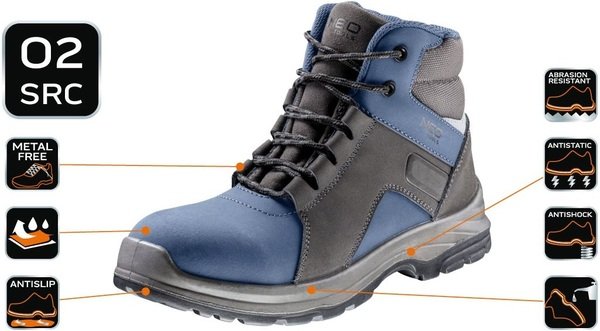 Черевики спеціальні 82-750 NEO класу S3 SRC захищають ноги від холоду, водостійкі та водонепроникні. Взуття дуже зручне, з високоякісного нубуку та з сітчастою обробкою всередині. Підошва виготовлена з матеріалу, завдяки якому верхній шар м'який і комфортний, а нижній шар оберігає підошву від зносу - стійкість підошви до впливу дизельного палива. Взуття відмінно захищає завдяки закритому заднику (поглинання енергії).