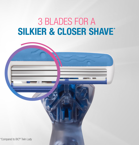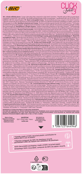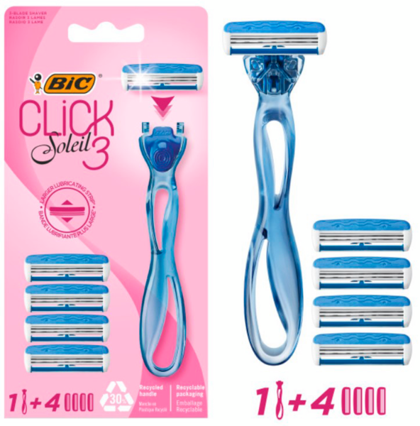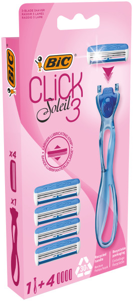 Жіночий набір для гоління BIC Click 3 Soleil з 1 верстатом, який на 30% складається з переробленого пластику, і 4 картриджами в пакуванні, придатному для перероблювання. Універсальна бритва з трьома лезами для бездоганно гладкого гоління з поворотною головкою для додаткового контролю. Картриджі, що замінюються за допомогою простого натискання, мають зволожувальну смужку, просочену какао-олією, що має заспокійливу дію. Вигнута блакитна ручка розроблена для надійного контролю, навіть якщо тримати її вологими руками.