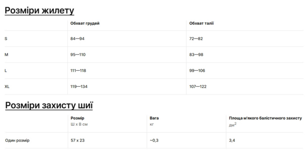 | Комплектація (можливі зміни в різних поставках) | Бронежилет |