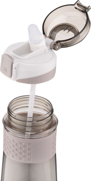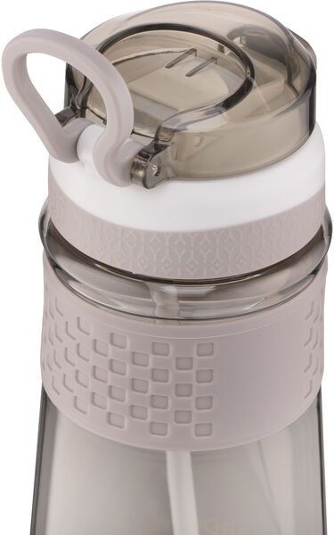 Виріб зроблено з пластику, можна мити в посудомийній машині. На пляшці є силіконова вставка, клапан для пиття закривається кришкою з фіксатором, всередині є знімна трубочка.