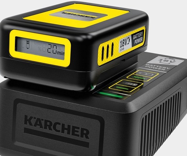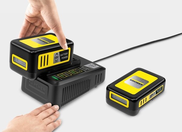 Швидке зарядний пристрій заряджає акумуляторну батарею Kärcher 18 В/2,5 Аг до 80% всього за 44 хвилини і може використовуватися для всіх батарей на 18-ти вольтной платформі Kärcher Battery Power.