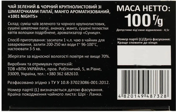 Edems 1001 ніч – композиція вишуканих сортів чорного і зеленого чаю з додаванням шматочків папаї, манго, пелюсток волошки і лотоса, ароматизована природними оліями. Розкішний букет напою 1001 ніч – це «ювелірна» робота професійних тітестерів і результат багаторічної праці, тому ви будете приємно здивовані смаком і ароматом цього чаю.