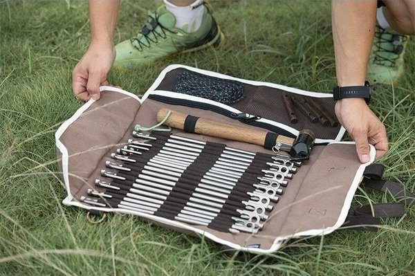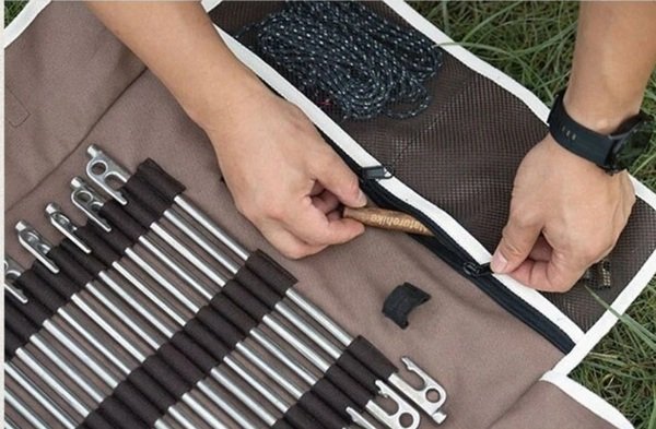 Чохол-органайзер вражає дизайном, простим, але оригінальним. Він місткий і функціональний. Кілки в чохлі досить легко розмістити для комфортного перенесення. Цей органайзер виготовлений з міцного матеріалу - полотна 16 ампер. Цей матеріал вирізняється жорсткістю та міцністю порівняно з іншими матеріалами, що використовуються для виготовлення чохлів. Кожне кільце має своє місце. Після розміщення в чохлі є можливість додаткової фіксації за допомогою ременів. Цей чохол розрахований на 20 кілків. Важливо зазначити, що в органайзері є додаткові відділення для розміщення кріплень для намету та мотузок. Така полотняна сумка також може бути розміщена в наметі в розгорнутому вигляді, ремені дадуть змогу надійно закріпити її в потрібному положенні. Цей чохол - незамінна річ для розміщення інструментів для кемпінгу, тож вона має бути в кожного, хто любить активний відпочинок.