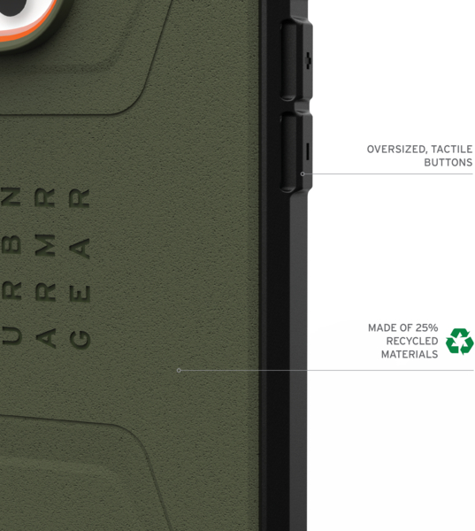 Створений для тих, хто цінує стиль, міцність і функціональність. Тонший, ніж у попередньому поколінні, чохол легко інтегрується з аксесуарами MagSafe для зручного заряджання. Завдяки технології потрійного лиття під тиском і шестигранним амортизаційним сердечником, чехол Civilian для iPhone 16 забезпечує захист від падінь на висоті 20 футів (6 метрів), гарантуючи, що ваш телефон буде в безпеці від падінь і щоденного використання. Рельєфний край захищає екран від подряпин і ударів, а протиковзка ручка надійно утримує пристрій у руці. Насолоджуйтеся чітким, чуйним натисканням великих тактильних кнопок для легкого керування на ходу.
