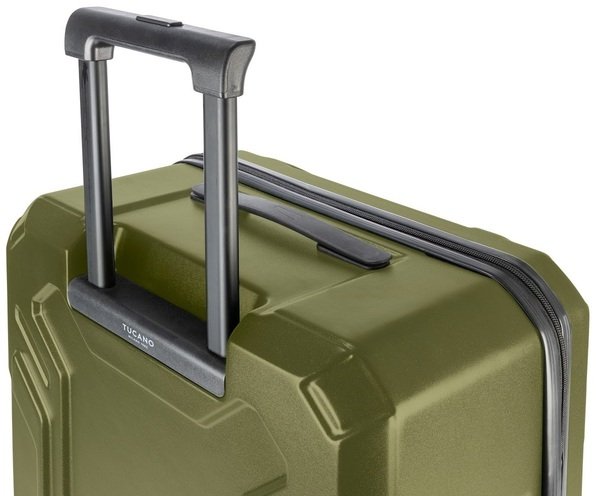 Валіза Tucano IRON M 72L – чотириколісна валіза з полікарбонату середнього розміру об`ємом 72 літри. Подвійні колеса з обертанням на 360 градусів, вертикальна та горизонтальна ручки для перенесення. Телескопічна ручка з фіксацією у 4-х положеннях висоти. Просторе внутрішнє відділення з тканинним роздільником на блискавці та подвійними еластичними ременями для фіксації поклажі. Замок TSA.