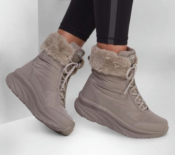 Насолоджуйтеся затишними прогулянками з комфортом і підтримкою в черевиках Skechers Relaxed Fit: D'Lux Walker - Winter Solstice. Ця водовідштовхувальна модель, розроблена для холодної погоди, має зручну шнурівку з тканого полотна, синтетичний верх, підкладку зі штучного хутра та м'яку устілку Skechers Memory Foam із системою повітряного охолодження, що забезпечує додатковий комфорт під час носіння. Вона ідеально підходить для зимових прогулянок, адже поєднує стильний дизайн, теплоту та високу функціональність.