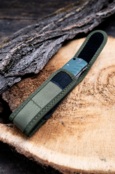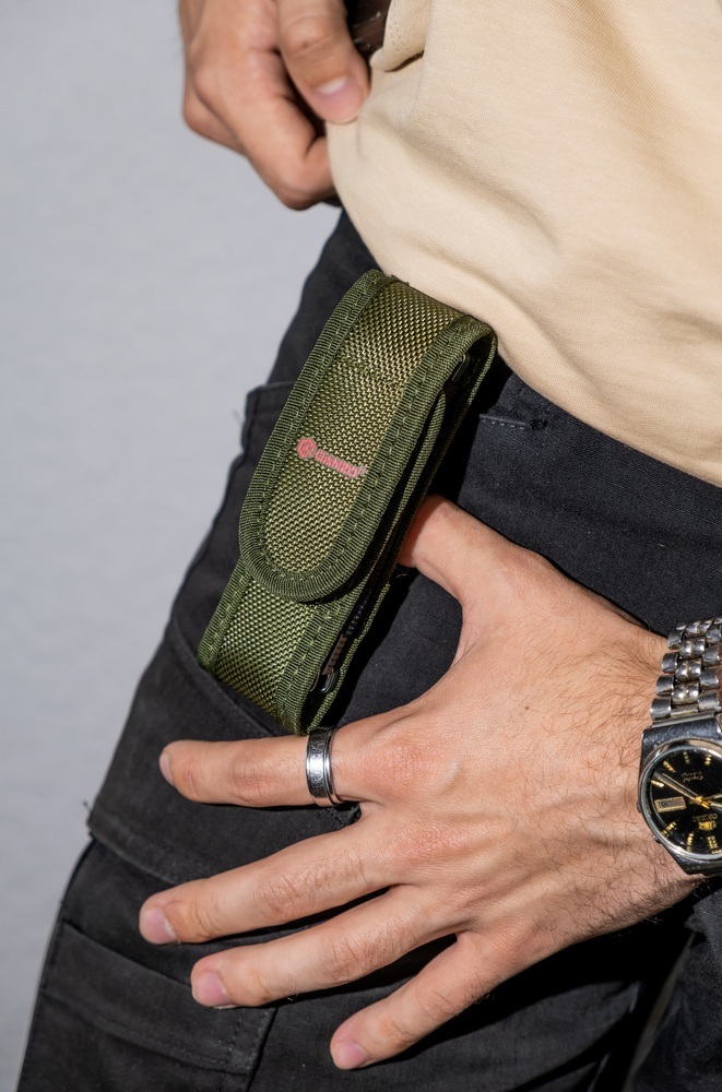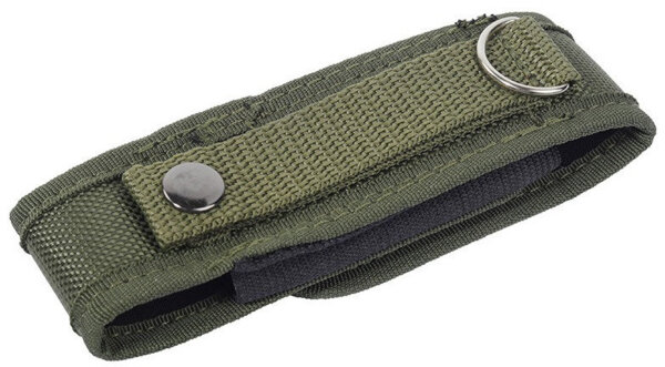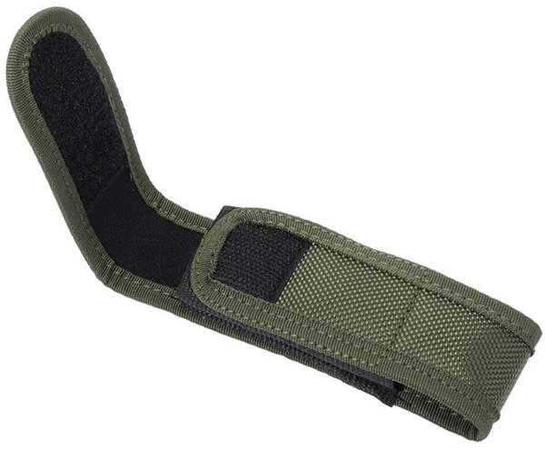 Розмір чохла по довжині легко налаштовується завдяки регульованій застібці на липучці. Бічні сторони виконані з більш тонкої стропи, а знизу є невеликий отвір, в який можна протягнути темляк або ланцюжок для додаткової фіксації ножа. На тильній стороні чохла є спеціальна лямка, пристібається до основи за допомогою кнопки. Таким чином, ніж в чохлі легко повісити на ремінь або зняти, коли це буде потрібно. Крім того, є металеве кільце, за яке його також можна підвісити.