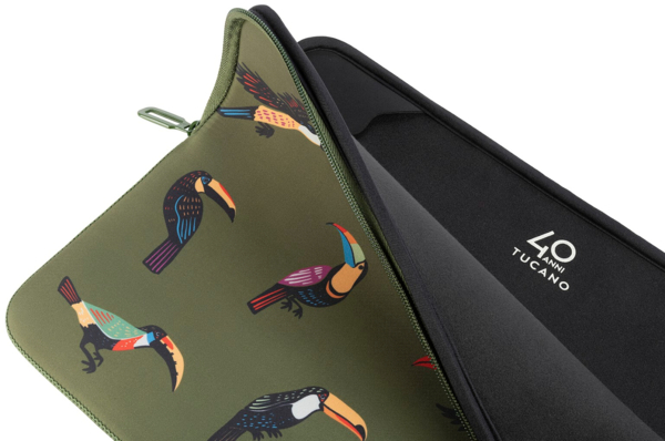 Чохол Tucano Tucani 13"/14" входить до ювілейної серії, присвяченої 40-річчю Tucano. Виконаний із гнучкого неопрену, він вирізняється легкістю та еластичністю. Система фіксації утримує ноутбук у сталому положенні, запобігаючи випадінню. Завдяки пласкому зшивному шву чохол зберігає тонкий силует і зручне прилягання. Внутрішнє оздоблення виготовлено з м’якого матеріалу, що оберігає поверхню пристрою. Подвійна блискавка забезпечує комфортне відкривання з обох боків.