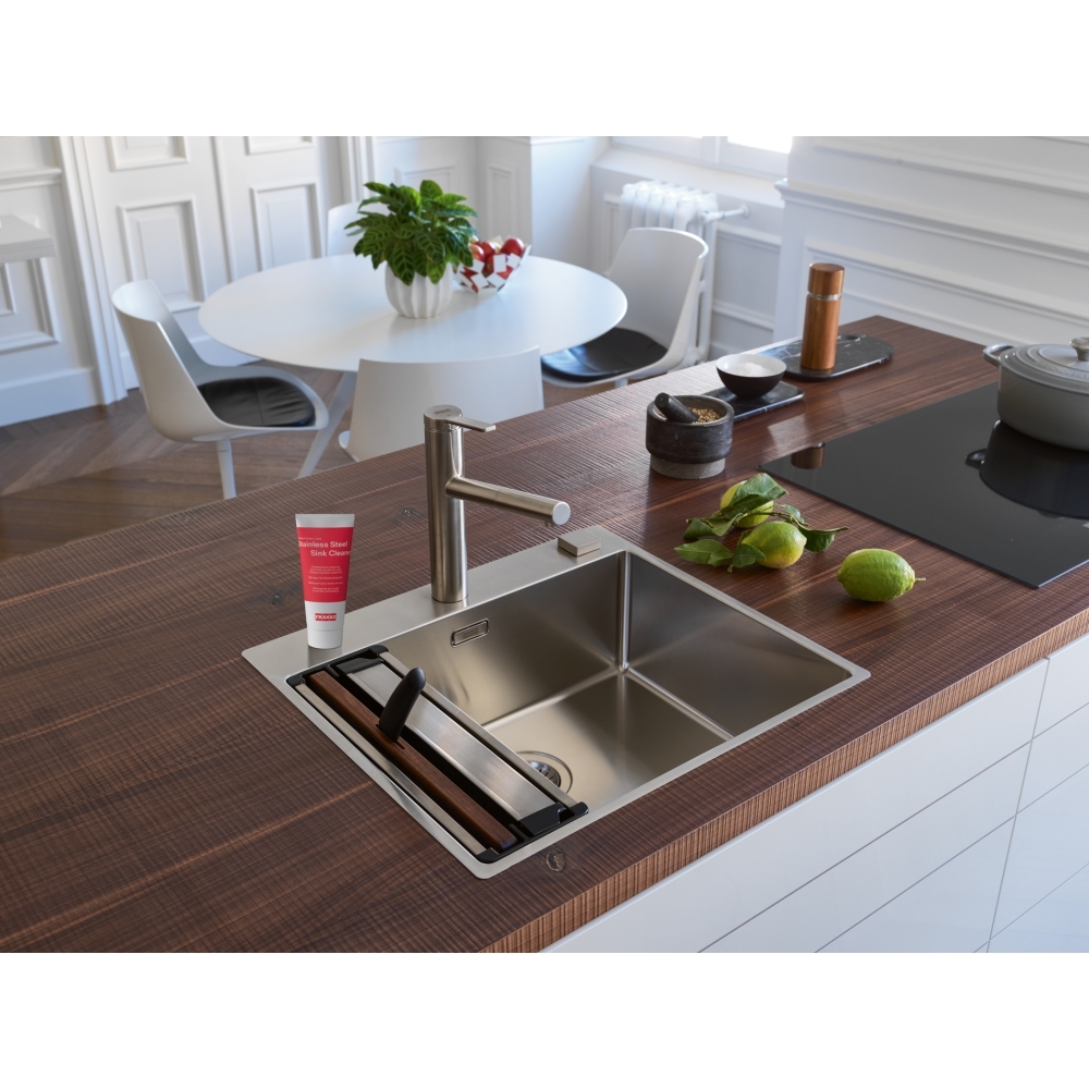 Засіб для догляду за мийками з нержавіючої сталі призначений для щоденного миття та профілактики утворення вапняних відкладень. Формула засобу містить компоненти, які ефективно усувають забруднення, запахи та ранні утворення вапняних відкладень, а також створюють непомітний захисний шар на поверхні, який надає блиску та має водовідштовхуючий ефект. Засіб має текстуру кремоподібної рідини. Для максимального ефекту рекомендується протирати мийку з використанням засобу під час кожного миття. Засіб наносять на ганчірку з мікрофібри та розтирають по поверхні мийки. Після нанесення краплі води не затримуватимуться на поверхні. Властивості: Дбайливо очищає поверхню, безкислотний і ніжний для шкіри, засіб відштовхує бруд завдяки ефекту лотоса, концентрована миюча суміш, приємний аромат, екологічно чистий. Застосування: Очищення та догляд за поверхнями мийок з нержавіючої сталі. Ідеально підходить для інтенсивного прибирання, щоденного прибирання. Для ще кращих результатів очищення використовуйте тканину з мікрофібри.