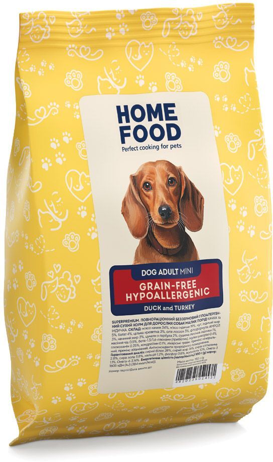 - Беззерновий гіпоалергенний сухий корм для дорослих собак малих порід Качка та індичка, 150 г - завдяки беззерновій формулі, корм можна давати вихованцям, які мають алергію на злакову групу.