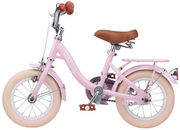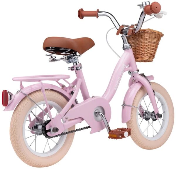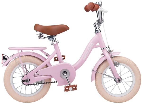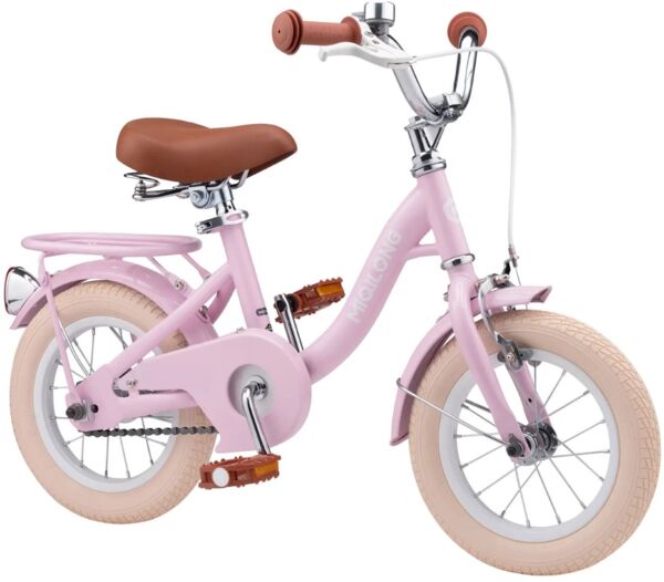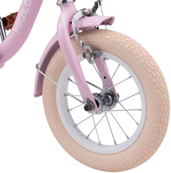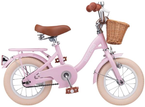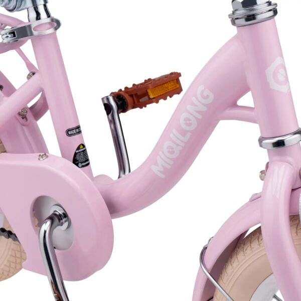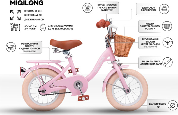 Велосипед для дітей Miqilong LS 12 - це втілення сучасного уявлення про ретро дизайн. Використання фарбування у стилі 50-х років XX століття та корзинки ручної роботи з натурального ротанга роблять дизайн велосипеда вишуканим та елегантним. Рама велосипеда виготовлена з металу та має необхідну міцність, щоб витримати всі навантаження навчання дитини катанню на велосипеді. Рама виконана за класичною високою схемою міського велосипеда з високим кермом. Це забезпечує зручне сідання та дозволяє дитині їздити на велосипеді з рівною поставою, без зайвих напружень. Кермо та сидіння регулюються по висоті в широкому діапазоні. Сидіння м'яке, з покриттям з ECO-шкіри та амортизаційними пружинами. Ручки керма м'які, гумові, з боковим захистом рук при падінні. Ручні гальма, U-Brake на передньому та барабанний механізм на задньому гарантують надійне гальмування. Колесо 12" стальне, традиційнезі спицями та класичною втулкою на підшипниках. Високий і широкий профіль покришок забезпечать комфортну їзду як по асфальту, так і по нерівностях. Колеса додатково захищені металевими бризговиками, забарвленими у колір велосипеда, що надійно захистить від бруду і бризк.