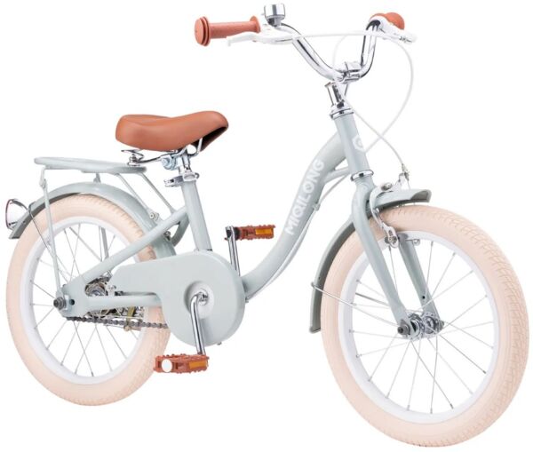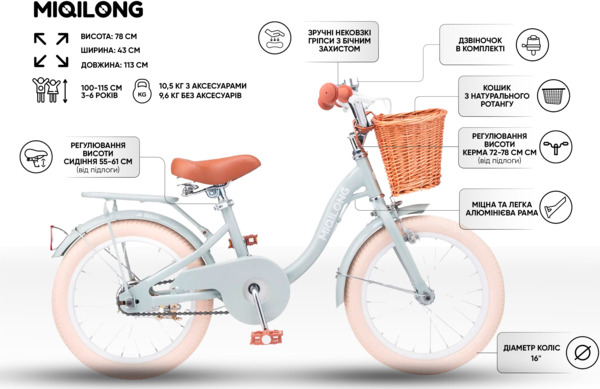 Дитячий велосипед Miqilong LS 16 дюймів - ідеальний вибір для маленьких любителів катання на 2 колесах. Завдяки своєму витонченому дизайну та міцній металевій рамі він гарантує комфорт та безпеку під час катання. Регульоване сидіння та кермо забезпечують зручну посадку для дітей різного зросту. Завдяки надійним гальмам та боковим навчальним колесам, велосипед легко освоюється малюками віком від 3 до 6 років. У комплекті ви знайдете все необхідне для швидкої збірки та обслуговування. Оберіть Miqilong для якісного та безпечного катання вашої дитини. Рама велосипеда стальна і має достатню міцність, щоб витримати всі навантаження пов'язані з навчанням дитини катанню на велосипеді. Рама виконана за класичною схемою міського велосипеда з високим кермом. Така конструкція забезпечує зручне сідання та дозволяє дитині їздити на велосипеді з рівною поставою, не вигинаючись та не горблячись. Додатково на рамі закріплений металевий багажник над заднім колесом. Кермо та сидіння регулюються по висоті в широкому діапазоні. Сидіння м'яке, з покриттям з ECO-шкіри та додатковими пружинами амортизації. Ручки керма м'які, гумові, з бічним захистом рук при падінні. Ручний гальмівний механізм U-Brake на передньому колесі та ножний гальмівний механізм на задньому. Така схема гальмування, де для зупинки заднього колеса потрібно натискати на педалі у зворотному напрямку, допоможе маленькій дитині легше звикнути до велосипеда, оскільки найменшим дітям іноді важко користуватися ручним гальмом. Диск колеса 16" традиційний, зі спицями та класичною втулкою на підшипниках. Високий та широкий профіль покришок забезпечить комфортну їзду як по асфальту, так і по нерівностях. Колеса додатково захищені металевими бризковиками, забарвленими у колір велосипеда.