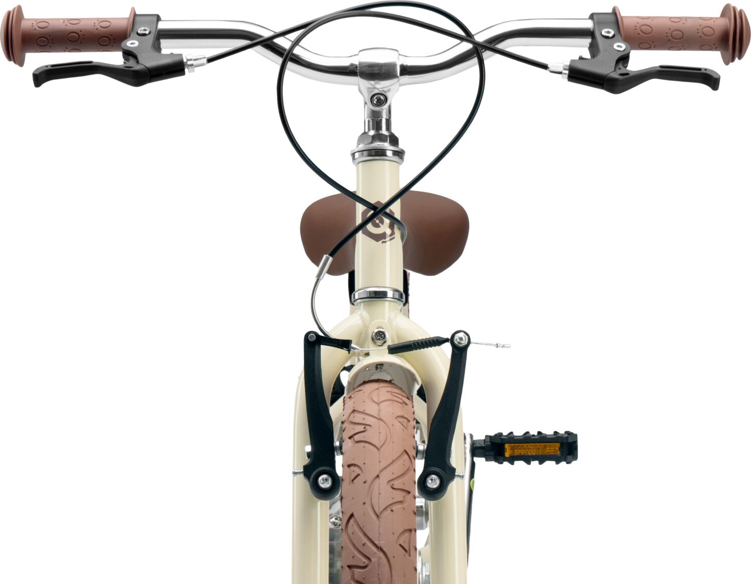 - Ручки керма м'які, гумові, з бічним захистом рук у разі падіння. Ручне гальмо, V-Brake на передньому і барабанний механізм на задньому гарантують надійне гальмування.